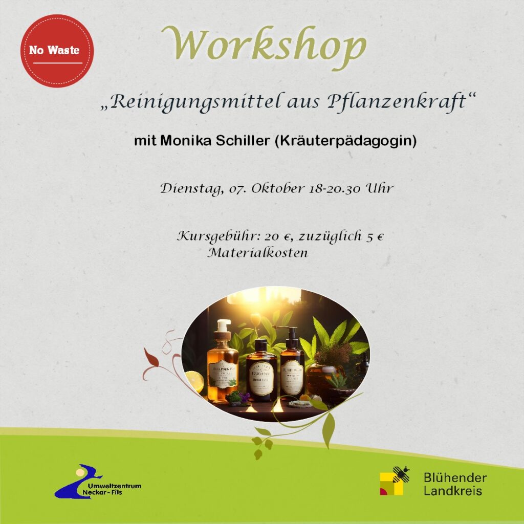 Müllvermeidung, Plastik einsparen und die natürliche Pflanzenkraft im Haushalt nutzen. Bei Reinigungsmitteln ist das auf den ersten Blick gar nicht so einfach. In diesen Workshop geht es um natürliche Reinigungsmittel und wie man sie selbst herstellt. Von Geschirrspülmittel über Waschmittel bis hin zu duftenden Raumspray, es ist von allem etwas dabei. Die hergestellten Produkte dürfen mit ausführlicher Anleitung mit nach Hause genommen werden.