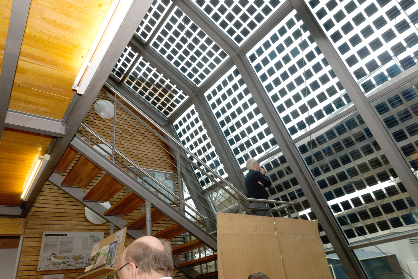 Im Mittelpunkt der Maßnahme stand die umfassende Sanierung der Glasfront zwischen den beiden Gebäudeteilen. Die über 25 Jahre alte Verglasung hatte zunehmend mit Dichtigkeitsproblemen zu kämpfen. Mit der Erneuerung wurde jedoch nicht nur die Wärmedämmung deutlich verbessert: Dank innovativer Technik konnten erstmals Photovoltaikzellen direkt in die Fenster integriert werden – eine Lösung, die in Baden-Württemberg bislang einzigartig ist.