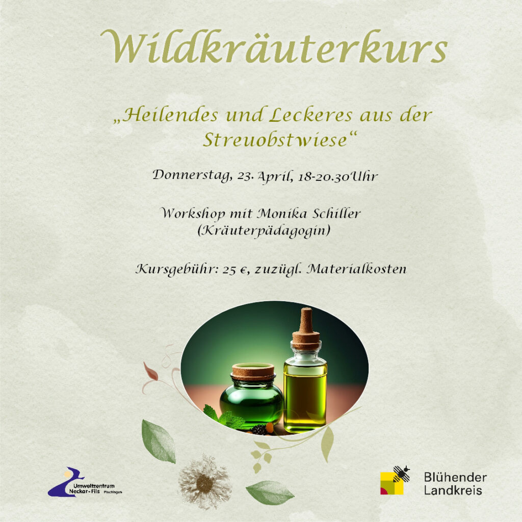 Neben dem herrlichen Obst bietet uns die Streuobstwiese einige Wildkräuter. Wir lernen die essbaren von den nicht essbaren Wildkräutern der Wiese zu unterscheiden und beschäftigen uns mit der Wirkung der Wildkräuter. Anschließend werden von den Kräutern im Umweltzentrum Kräuteröle und eine heilende Tinktur angesetzt und wilde Wiesensnacks verköstigt.